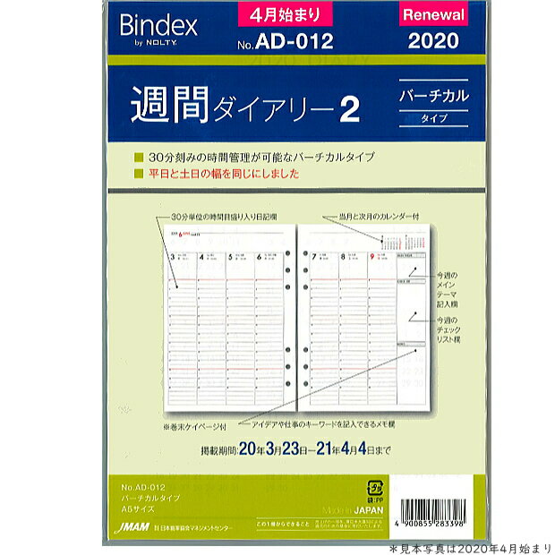 商品名 週間ダイアリー2 バーチカルタイプ A5サイズ リフィル 4月始まり Bindex バインデックス システム手帳 ダイアリーリフィール 品番 No.AD-012 サイズ 縦210×横148mm (A5サイズ、デスクサイズ 6穴) 仕様 オリジナルクリーム用紙 六曜入 見開き1週間 時間目盛 8:00〜20:00 縦型バーチカルタイプ 年間カレンダー、年間計画表、月間テーマ、年齢早見表、度量衡換算表、 掲載期間 2020年3月23日〜2020年4月4日 メーカー JMAM (株)日本能率協会マネジメントセンター 30分刻みの管理が可能なバーチカルタイプ。